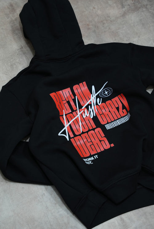 Black zip-up hoodie with a clean, premium streetwear aesthetic.